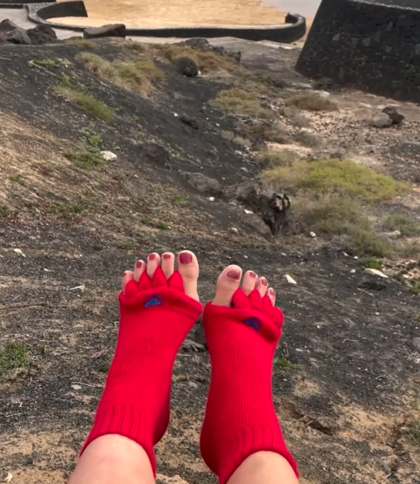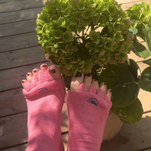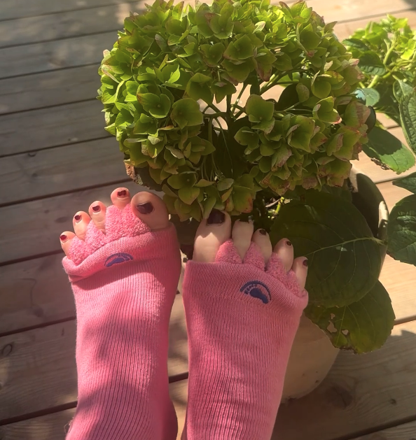 ”My-Happy Feet är fantastiska för fötter med felställningar, särskilt i tårna. Men de är också fantastiska för friska fötter som blir beroende av att tårna sprids dagligen. Mina egna fötter älskar att gå i strumporna – och det ger välbefinnande för hela kroppen. Det är enkelt och kräver inget mer än att ta på dem!”