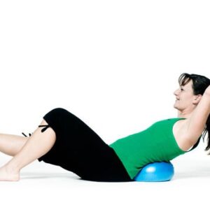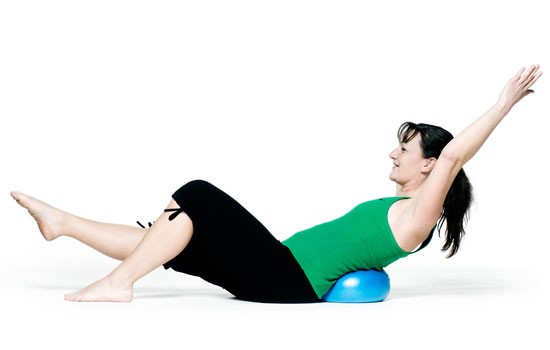 Sidocrunch: Ligg ner med bollen under ryggen, böjda knän och fötterna höftbrett isär. Luta dig lätt bakåt över bollen och placera fingrarna vid öronen. Lyft nu överkroppen genom att runda ryggen medan du sträcker en arm över kroppen till sidan av motsatt ben. Sänk ner igen och upprepa på andra sidan.