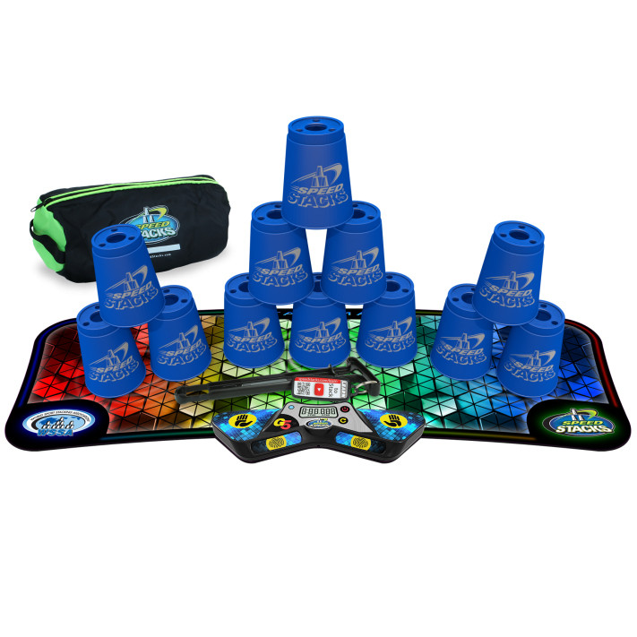 Detta kompletta Speed Stacks-set GEN5 är ”mest prisvärt” då det innehåller allt du behöver, 12 st. blåa koppar, timer, matta, väska och en quick stem som håller kopparna på plats vid förvaring.